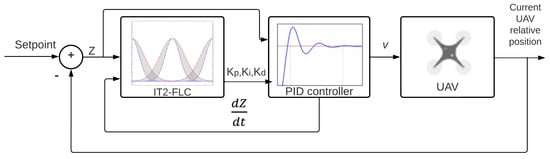 In this work, two type-2 fuzzy-PID controllers, IT2_PID_v and IT2_PID_r, were adopted. The first is related to the lateral error Z, which also considers its time derivative, and the second is related to the angular error and its derivative. Both operate independently to minimize errors simultaneously as the UAV follows the trajectory. Figure 7 displays the schematic of the IT2_PID control used to control the input variable Z. , and are the proportional, integrative and derivative gains. v is the roll velocity. The controller for the error is similarly built.