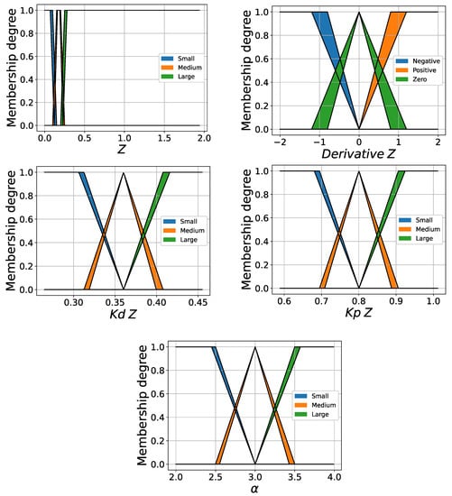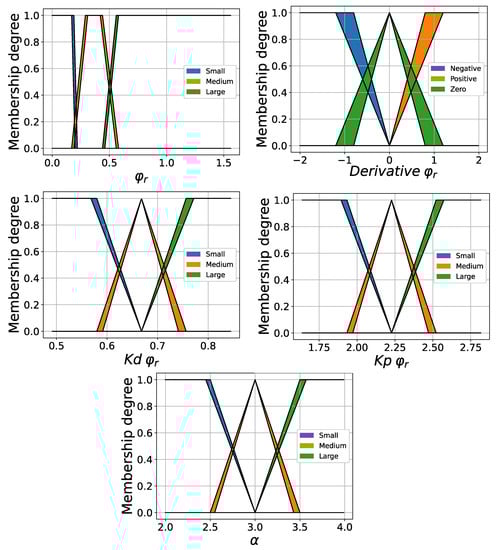 The input variables (i.e., errors and time derivatives) are transformed into fuzzy sets through the fuzzification process represented by the membership functions shown in Figure 8 and Figure 9. Finally, the outputs are subjected to a defuzzification stage to establish precise gain values.