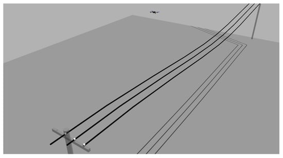 For this purpose, a scenario was developed consisting of transmission towers connected by power cables, as seen in Figure 10. The UAV was simulated via a PX4 flight controller through Software-in-the-Loop (SITL) simulation. The control node proposed in this paper receives visual information from the frontal camera attached to the UAV, estimates the relative position to the lines, and calculates the PID gains that are converted into a velocity command, which is sent to the light management unit (FMU) through an ROS driver, the MAVROS. It is worth noting that the fuzzy controllers were developed using the Python library PyIT2FLS [43].