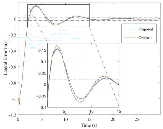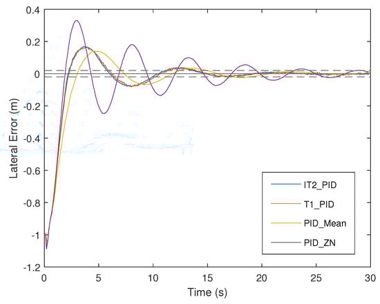 Initially, the experiments were conducted involving the lateral control of the drone. For this purpose, the drone was positioned four meters above the lines, with a one-meter offset from the middle cable. The proposed controller, IT2_PID, was compared with a similar type-1 controller (T1_PID), the classic Ziegler–Nichols PID controller, and a PID controller using the mean gains assumed for the fuzzy approaches. The reason for this analysis is to investigate the capability of the proposed controller to adapt to different input scenarios compared with fixed-gain approaches.