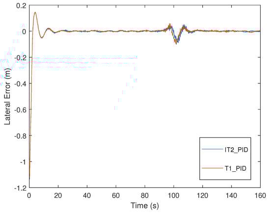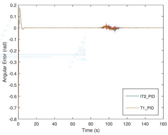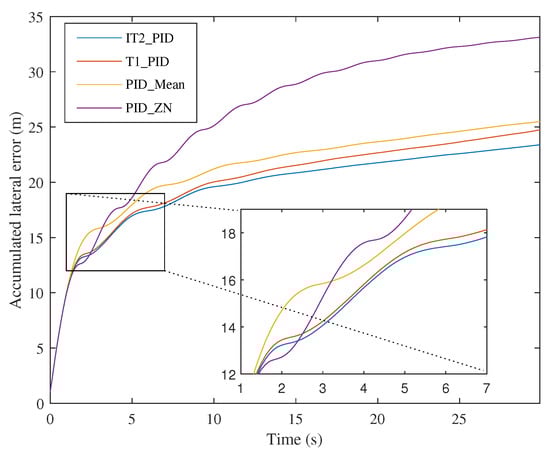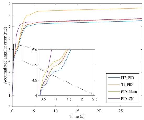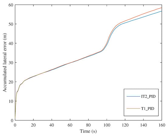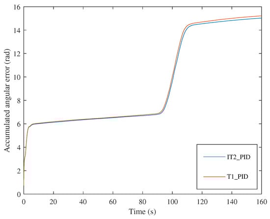 The numerical results for the IAE are presented in Table 7. The IT2_PID controller achieved better performance for both the lateral and angular errors. This behavior can be explained by the capability of type-2 fuzzy systems to better cope with uncertainties in the input and output variables of the model [44]. Figure 18 and Figure 19 present the accumulated errors during the mission. It is possible to notice that the two controllers behave similarly for both variables, with a slight advantage of the IT2_PID controller. When uncertainty is inserted into the model, the difference between the curves becomes more significant for both variables, highlighting the better performance of type-2 fuzzy systems in such scenarios.