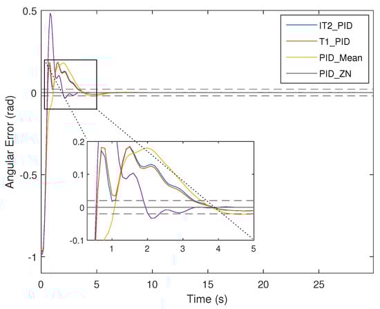 As observed for the lateral controller, the IT2_PID controller has outperformed the T1_PID over both the IAE and the considering the mean values. This can also be noted by a slight reduction in the error deviation. From Figure 15, it can be noticed that the difference in the cumulative error between the two methods was again in the transient state of the system, remaining relatively unchanged throughout the steady state. At approximately 1.5 s, the cumulative error of the PID_Mean increases, which emphasizes the capability of adaptive models to deal with several different settings.
