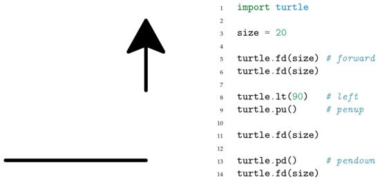 Turtle is a graphics package in the standard Python distribution (https://docs.python.org/3/library/turtle.html, accessed on 19 January 2023). This package allows a user to control an agent (the “turtle”) on a 2D plane (the “canvas”). The user controls the turtle either by writing a script or interactively from the command prompt. The user moves the turtle around and controls a “pen” that draws a line when the pen is “down” (i.e., in contact with the canvas). A certain amount of the canvas is visible to the user on the screen, but the turtle can move and draw outside this too. This allows for immediate visual feedback that shows the live progress of the turtle. It is based on the Logo programming language, which has been used to program physical turtle robots (https://web.archive.org/web/20150131192445/https://el.media.mit.edu/logo-foundation/logo/turtle.html, accessed on 19 January 2023) and provides a Logo-like set of commands via Python methods. The turtle only operates in a 2D world and cannot be used to create 3D dimensional objects.