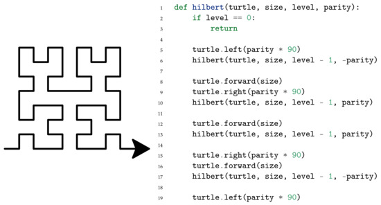 Figure 2 shows the output (left) of a more complicated Turtle program (right), which draws the Hilbert Curve and is available in CPython’s Turtle demo files (https://github.com/python/cpython/blob/4b8d2a1b40b88e4c658b3f5f450c146c78f2e6bd/Lib/turtledemo/fractalcurves.py, accessed on 19 January 2023). It recursively calls itself, changing the direction it faces based on an alternating parity.