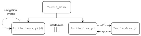 At the top of Figure 3, Turtle_main represents the turtle, which is the high-level process that we can make assertions about to check the properties of our system as a whole. The Turtle_main process is composed of the Turtle_nav and Turtle_draw_pd processes running interleaved, and it passes the model’s initial parameters to these more specialised processes. This modular design strategy of composing it out of smaller specialised processes makes it more easily extensible. The navigation and drawing functionalities can be easily separated in this case as they run independently of each other and do not need to synchronise on any events. This independence of processes is why the interleave command can be used. If synchronisation were needed, CSP has a parallel operator that takes two processes and a set of events that they must synchronise on (meaning they would perform those events in unison).