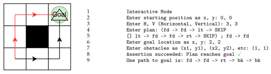 For example, the three problem maps shown in Figure 9 illustrate increasing levels of difficulty, which each need steadily more complicated plans with more operators. The simple map in Figure 9a only requires the student to know how the prefix operator works; it can be solved with the plan . The map in Figure 9b introduces the student to turning, so they could solve the map with the plan . Finally, for the map in Figure 9c the student would be asked to provide a plan that gave both possible routes to the goal. This would introduce them to the external choice operator (□), which is needed to solve this map. The student would need to submit a plan such as: to solve the map.
