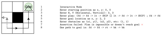 - Meywerk, T.; Walter, M.; Herdt, V.; GroBe, D.; Drechsler, R. Towards Formal Verification of Plans for Cognition-Enabled Autonomous Robotic Agents. In Proceedings of the 2019 22nd Euromicro Conference on Digital System Design (DSD), Kallithea, Greece, 28–30 August 2019; pp. 129–136. [Google Scholar] [CrossRef]