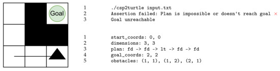 Figure 7 illustrates when the file input.txt is passed as an argument at the command line. Even though the turtle would not exit the world boundaries, it fails to reach the goal. Therefore, CSP2Turtle reports that the assertion fails and it produces a path that would successfully lead the turtle to the goal. We have also listed the contents of the input.txt file here. Note that the turtle’s starting location is at co-ordinate (0,1), where the default state of the turtle is with the pen down. The turtle follows the plan, moving forward. The pu event causes the absence of a line from co-ordinate (1,1) as the turtle moves forward once again.