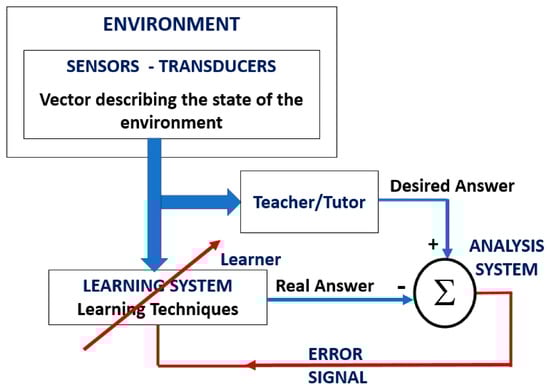 (2) Learning—In this step supervised learning takes place. This is where the parameters of the artificial neural network are adjusted based on the training vector and on the error signal, which is defined by the difference between the desired response and the real response of the network. In this step, the artificial neural network simulates the Tutor, transferring the knowledge of the environment to the Learner. In general, the optimization of the emulation is verified through statistical calculation to confirm that the knowledge of the environment is transferred to the learner in a complete way;