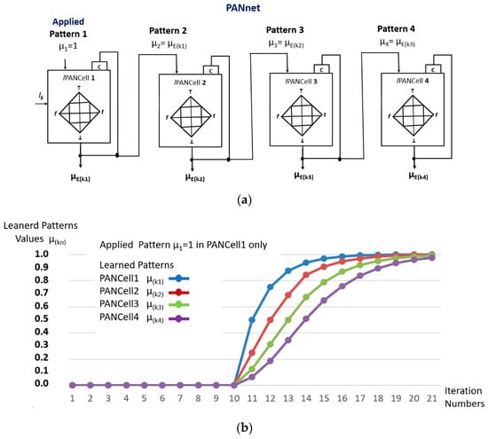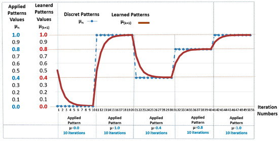It was verified that after repeatedly receiving its input, the value of the pattern μ1 resulted in an ascending monotonic curve appearing, which demonstrates the cell’s learning after the convergence in output μ(k+1) = 1.0.