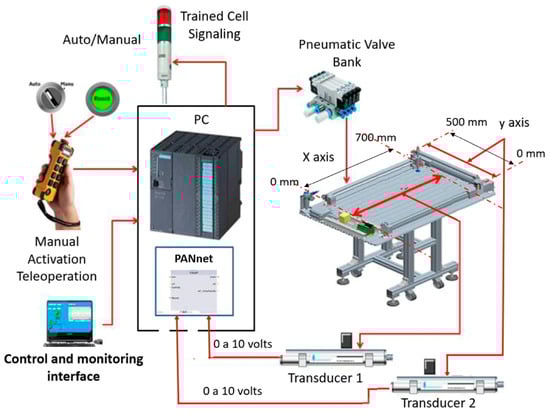 After the teleoperation learning stage, the linear Cartesian robot receives the signal (uE_Signaled) warning that the imitation action is available. In this imitation stage, the x and y axis transducers allow real-time monitoring. Therefore, in the operation of the machine tool moving the workpieces, the transducers provide information about the real-time trajectory that is being developed by the linear Cartesian robot.