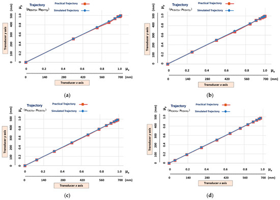 The graphic results of the linear Cartesian robot learning the linear trajectories. (a) Transition states (µE(k21)x, µE(k11)y). (b) Transition states (µE(k22)x, µE(k12)y). (c) Transition states (µE(k23)x, µE(k13)y). (d) Transition states (µE(k24)x, µE(k14)y).