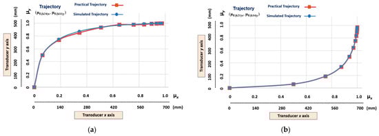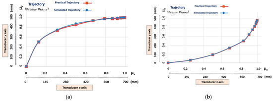 The graphic results of the linear Cartesian robot learning the non-linear trajectories with a higher level of slope. (a) Transition states (μE(k24)x, μE(k11)y). (b) Transition states (μE(k22)x, μE(k12)y).