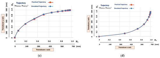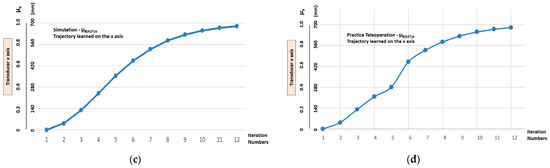 The graphic results of the imitation step after the linear Cartesian robot having learnt the trajectory (μE(k21)x, μE(k14)y) with the highest level of nonlinearity. (a) Y-axis trajectory—μE(k14)y output learnt via simulation. (b) Y-axis trajectory—μE(k14)y output learnt via teleoperation. (c) X-axis trajectory—μE(k21)x learnt via simulation. (d) X-axis trajectory—μE(k21)x output learnt via teleoperation.