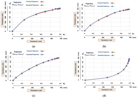 The graphic results of the linear Cartesian robot learning the non-linear trajectories with a medium level of slope. (a) Transition states (µE(k23)x, µE(k11)y). (b) Transition states (µE(k22)x, µE(k14)y). (c) Transition states (µE(k24)x, µE(k12)y). (d) Transition states (µE(k21)x, µE(k13)y).