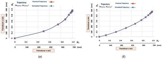 The graphic results of the linear Cartesian robot learning the non-linear trajectories with a low level of slope. (a) Transition states (µE(k22)x, µE(k11)y). (b) Transition states (µE(k22)x, µE(k13)y). (c) Transition states (µE(k24)x, µE(k13)y). (d)Transition states (µE(k21)x, µE(k12)y). (e) Transition states (µE(k23)x, µE(k12)y). (f) Transition states (µE(k23)x, µE(k14)y).