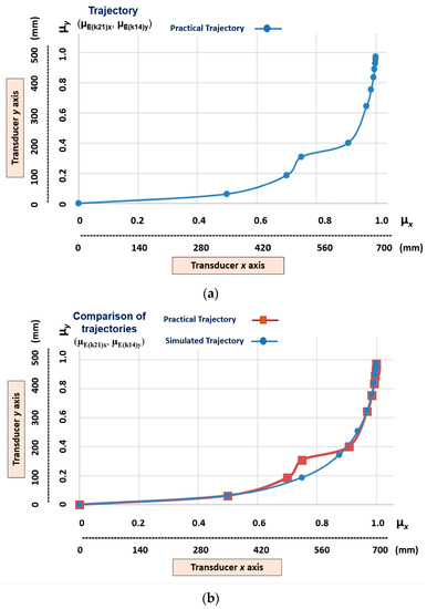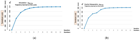 The graphic practical results compared to the simulated results. (a) Trajectory with the x and y axes—outputs of the transition states (µE(k21)x, µE(k14)y) learnt via teleoperation. (b) Comparison between the trajectory learnt via teleoperation and the trajectory learnt via simulation.