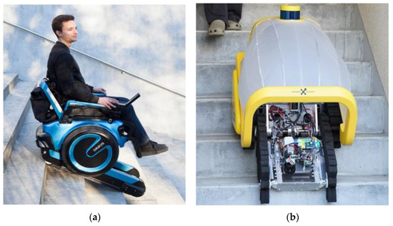 | All-Terrain Wheelchair [34]. Adapted with permission ref. [34] 2017 Janez Podobnik | ![]() | Prototype solution, automatic stair-climbing system, self-balancing software control, Chebyshev-based linkage mechanism for lifting and lowering the tracks |
