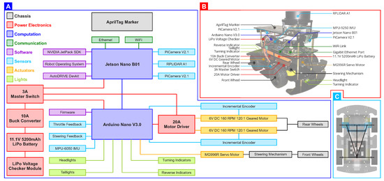 Native vehicle (Nigel) of the AutoDRIVE Ecosystem: (A) high-level vehicle architecture; (B) various components and sub-systems of the vehicle; (C) open-source chassis of the vehicle adopting rear-wheel drive, Ackermann steered actuation mechanism.