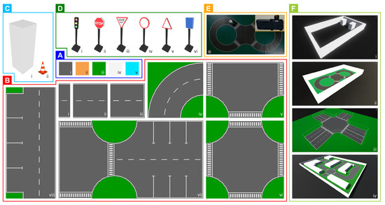 Modular and reconfigurable infrastructure development kit of the AutoDRIVE Ecosystem: (A) terrain modules—(i) asphalt, (ii) dirt, (iii) lawn, (iv) snow, (v) water; (B) road kit—(i) road patch, (ii) straight road, (iii) dead-end, (iv) curved road, (v) 3-way intersection, (vi) 4-way intersection, (vii) parking lot, (viii) roadside parking; (C) obstruction modules—(i) construction box, (ii) traffic cone; (D) traffic elements—(i) traffic light, (ii) stop sign, (iii) give way sign, (iv) regulatory sign, (v) cautionary sign, (vi) informatory sign; (E) surveillance elements—vehicle localization using the AutoDRIVE Eye; (F) preconfigured maps—(i) Parking School, (ii) Driving School, (iii) Intersection School, (iv) Tiny Town.
