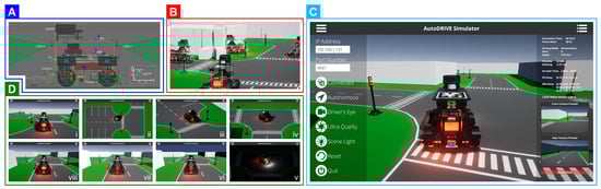 Native simulation platform of the AutoDRIVE Ecosystem: (A) simulation of vehicle dynamics, sensors and actuators; (B) simulation of infrastructure dynamics and interaction physics; (C) graphical user interface of the simulator; (D) simulator features—(i) Driver’s Eye camera, (ii) Bird’s Eye camera, (iii) God’s Eye camera, (iv) scene light enabled, (v) scene light disabled, (vi) low-quality graphics, (vii) high-quality graphics, (viii) ultra-quality graphics.
