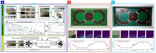 Behavioral cloning: (A) high-level architecture of the training and deployment pipelines; (B,C) depict behavioral analysis of the autonomous vehicle in virtual and real-world settings, respectively—(i) trajectory tracked by the vehicle, (ii) a sample pre-processed camera frame fed as input to the neural network, (iii), (iv) and (v) depict activation maps of the first, second and third convolutional layers of the neural network, respectively, (vi) salient activations from all the activation maps, (vii) neural network prediction analysis for one complete lap. Video: https://youtu.be/rejpoogaXOE (accessed on 11 May 2021).