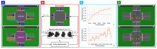 Intersection traversal: (A) learning scenario descriptions; (B) deep reinforcement learning architecture; (C,D), respectively, depict training and deployment results—(i) single-agent learning scenario, (ii) multi-agent learning scenario. Video: https://youtu.be/AEFJbDzOpcM (accessed on 8 April 2021).
