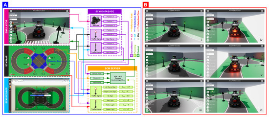 Smart city management: (A) high-level architecture of the autonomy algorithm; (B) snapshot instances from simulation—(i) vehicle observing left-curve sign, (ii) vehicle observing right-curve sign, (iii) vehicle crossing the intersection, (iv) vehicle stopping at red light, (v) vehicle stopping at yellow light, (vi) vehicle resuming on green light; the traffic lights are toggled manually. Video: https://youtu.be/fnxOpV1gFXo (accessed on 5 May 2021).