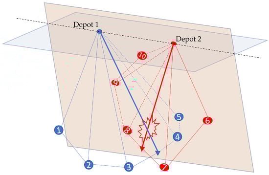 The value of t obtained upon solving (7) is the time after which the tethers are anticipated to entangle. If t is a positive real value within the range allowed by both vehicles’ schedules, the cables will become a co-planner and may become entangled if the cable segments intersect. Based on this fact, Algorithm 5 tries to find all possible entanglements within the initial routes. For a time interval between two consecutive departures and , it simulates the movement of the vehicles and examines the concurrent cable planes. If entanglement is not detected, it selects vehicle P associated with , updates and , and examines the new cable plane of P against other concurrent cable planes using (7). The steps are repeated until either an entanglement is detected or the time interval associated with the last departure is passed without an entanglement. If entanglement is confirmed, it either modifies the existing routes based on Algorithm 6 or adjusts the time schedules based on Algorithm 7. The heuristic chooses the approach that resolves the entanglement at the expense of a lower maximum tour cost and accordingly updates the schedule or routes. Consequently, the algorithm re-initiates a fresh detection for an entanglement from the beginning at time . As a last step, the algorithm only checks if the current solution is better than the solution only with time scheduling. This step is added because (1) the time scheduling only can run very fast, and (2) modifying the routes at the beginning causes a drastic delay in the final result for some cases.