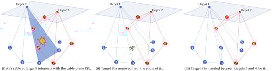 The route modification approach in Algorithm 6 tries to find alternate routes by reallocating the node relevant to the entanglement. For example, if the cable vector of intersects with , the responsible node is removed from ’s route and awarded to another vehicle with the lowest maximum tour time. Figure 2 shows how the approach works with an example. In this example, there is possible entanglement when travels between targets 3 and 4 while travels between targets 7 and 8 in the initial routes as shown in the far left figure. Thus, target 8 is removed from the route of and inserted for between targets 3 and 4.