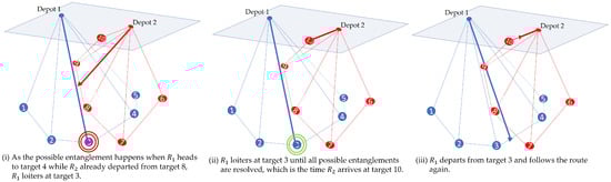 On the other hand, the time scheduling approach in Algorithm 7 adjusts the schedules while forcing one of the vehicles involved in the entanglement to loiter on the starting node on the plane involved in possible entanglement. It compares the loitering time to avoid entanglement and chooses a more efficient one. Figure 3 shows the rescheduling between the vehicles for the same example in Figure 2. There exists a possible entanglement when travels between targets 3 and 4 while travels between targets 7 and 8. As leaves the departing target earlier than , waits at target 3 until all possible entanglements are resolved. Thus, restarts to follow the route when arrives at target 10.