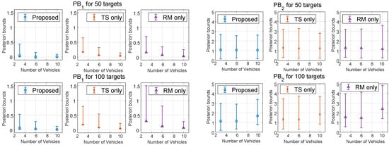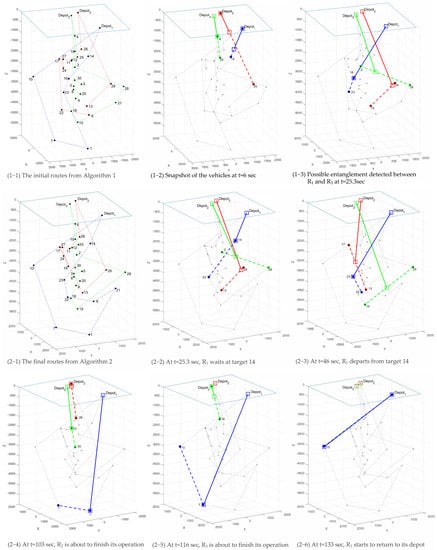 In Figure 4, the left shows , comparing the gaps to the lower bounds with gaps between the upper and lower bounds. The right presents , comparing the costs with the lower bounds. The marker shows the average, while the bar shows the minimum and maximum values. In both figures, RM represents the route modification approach, and TS represents the time scheduling approach. The proposed approach is a hybrid of the two approaches. The average posteriori bounds for the proposed approach had the best solution quality among the compared methods while staying considerably closer to the minimum. This means that the results are consistent most of the time while only occasionally having some poorer cases. For , the minimum bounds for the proposed and route modification-only methods have negative and less than 1 values, showing that the routes are improved by modification of the initial routes provided by the primal-dual heuristic, which is used as the lower bound. While the solution quality stayed consistent for 50 targets, the largest problem size had some increased gap from the lower bound for the proposed method. This makes sense as the number of vehicles and targets increase, and more entanglement issues can arise from the initial routes. The route modification-only method had the worst performance and the longest computation time. This method tries to remove all the possible crossing surfaces by exchanging nodes, resulting in having an overloaded vehicle with high computation time in some cases. While the time scheduling-only method solves the problem instantly, in less than 1 s for all cases, as shown in Table 1, the solution qualities were not as good as the proposed approach because some vehicles often need to loiter for a long time to resolve the entanglement issues. Thus, the proposed approach took advantage of both methods and produced the best solutions among the methods within a reasonable computation time. Although it compares the two methods every time it detects a possible entanglement, the proposed method’s computation time is considerably shorter than the route modification-only method because changing the route at a certain iteration changes the rest of the schedules. Therefore, the number of possible entanglement changes depending on which method was chosen in the previous step and affects both solution quality and computation time. The computational results show the algorithm’s potential to be implemented in real-world applications, delivering an affordable solution within an average of 11.66 s for the largest problem size, staying less than 1.5 of the ratio from a lower bound that does not consider the entanglement. Lastly, Figure 5 shows an example instance with 3 vehicles and 30 targets. As the possible entanglement is detected for the initial routes produced by Algorithm 1, Algorithm 5 updated the routes to avoid entanglements. As shown in Figure 5 of 1-1 and 2-1, some targets were exchanged between the vehicles while time scheduling was also performed in 2-2.