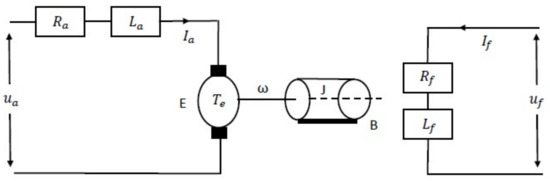 where and . The symbol E represents the back EMF, while represents the electric torque. The armature current and field current are represented by and , respectively.