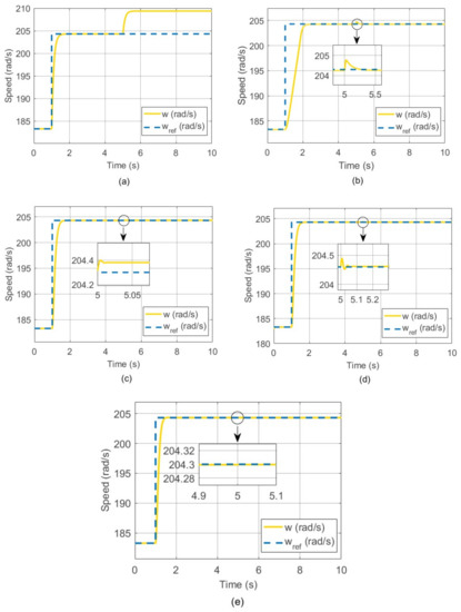 Output speed signals: (a) FBL, (b) SMC, (c) AB (case 1), (d) AB (case 2), (e) AB–ISMC.