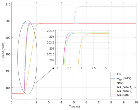 The FBL technique demonstrates a favorable settling time of s compared to SMC, but suffers from a significant steady-state error of 5 rad/s when subjected to load disturbances. On the other hand, SMC has the highest settling time of s, but it effectively rejects the load torque disturbance and returns to the reference speed after a slight peak. The AB controllers (case 1 and case 2) exhibit comparatively lower settling time than FBL and SMC ( s and s, respectively). However, after the load torque disturbance is applied in case 1, a steady-state error of rad/s is observed. Compared to all of the above control techniques, the proposed controller (AB–ISMC) has a minimum settling time of s. This depicts good speed tracking characteristics and improves settling time by factors of , , , and compared to FBL, SMC, and AB controllers (case 1 and case 2), respectively, demonstrating its superior performance characteristics.