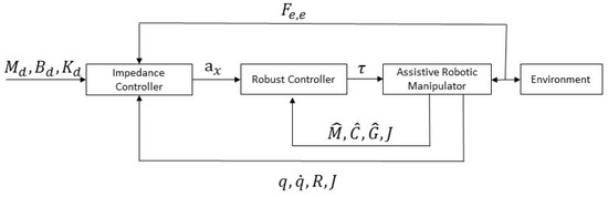 While assistive robotic devices such as Wheelchair-Mounted Robotic Arms (WMRAs) [1,2,3,4,5] and Companion Robots [6,7,8,9,10] traditionally help users with object retrieval [11,12] or pick-and-place tasks [13], they are quite capable of physical human–robot interaction (PHRI) with the user themselves. Users with disabilities have a need for assistance with activities of daily livings (ADLs) such hair-grooming, scratching, face-sponging, etc.; these ADLs require physical interaction with various surfaces on the human body. Under this need, the assistive robot’s end-effector (tool) has to be able to align with the unknown (human) surface, and also apply a desired force in the normal direction while following the surface based on desired velocity profiles that the user can command to the robot. During interaction, it is paramount to ensure that the assistive robot can establish safe and compliant contact with the human user.