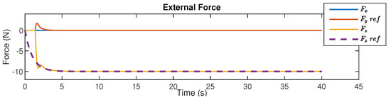 where denote desired mass, damping, and stiffness matrices (note all non-zero matrix elements are positive design constants), while denotes the force error with denoting the desired force in the z-direction. In order to achieve the desired dynamics of (23), the auxiliary control term can now be designed as follows: