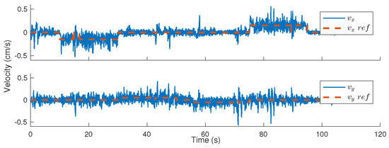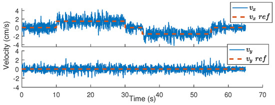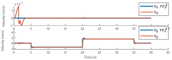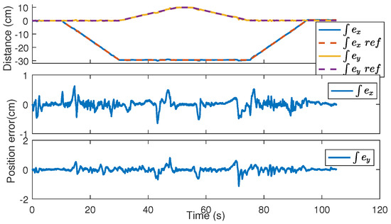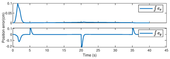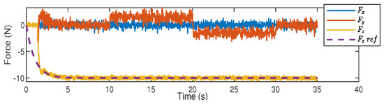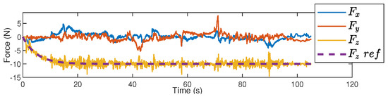 In the second experiment, we commanded as the desired force in the end-effector z-direction and the desired velocity was set to 0 from 0–10 s for the initial alignment and ±1.5 cm/s along the end-effector x-direction during the movement. The movement of the manipulator is shown in Figure 20.