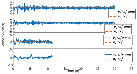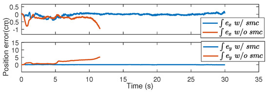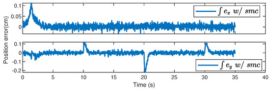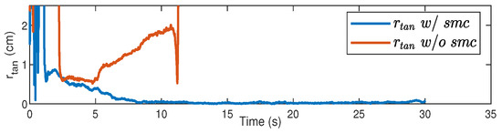 The first experiment focused on the alignment and stabilization of the end-effector with respect to the environment in order to highlight the critical role of sliding mode control (SMC). Here, we commanded 0 cm/s desired x and y velocities to the end-effector and as the desired force in the end-effector z-direction. From Figure 15, Figure 16, Figure 17, Figure 18 and Figure 19, it can be seen that use of SMC leads to the interaction force along the end-effector z-direction being regulated to around 10N with error while the position error was less than 0.2 cm after the end-effector aligned with the surface. The figures also show that the system does not converge without application of SMC. The interaction torque was seen to decrease to less than , and the equivalent lever converged to around 0.3 mm; both results clearly illustrate that the end-effector aligned along the yoga ball surface with high fidelity through the course of the experiment.
