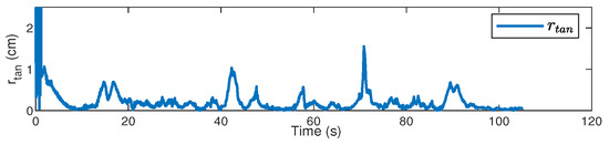 For the third experiment, we replaced the ball environment with a mannequin with an irregular surface typical of the back of a human torso. The movement of the manipulator is shown in Figure 26. From 0 to 10 s, we commanded the same force along the end-effector z-direction. Then, we set for 10–30 s, , for 30–50 s, , for 50–55 s, and then commanded the same velocities in the opposite direction. From Figure 27, Figure 28, Figure 29, Figure 30 and Figure 31, it can be seen that the overall position/velocity tracking and force regulation performance was close to expected. However, the performance was comparatively degraded with respect to the results in the second experiment due to the high stiffness and the sharp curvature changes in the surface of the mannequin. During the time periods when the end-effector moved over the sharp curvature regions on the mannequin back, such as 13–18 s, 40–45 s, 70–73 s, and 88–93 s, the force tracking and position tracking and alignment were affected. The force in the end-effector z-direction reduced to 4 N for about 0.1 s, the position error increased to 0.6 cm, the equivalent lever also increased to between 1 and cm, but the degradation was seen to happen for short periods and the force and position/velocity tracking profiles recovered each time.