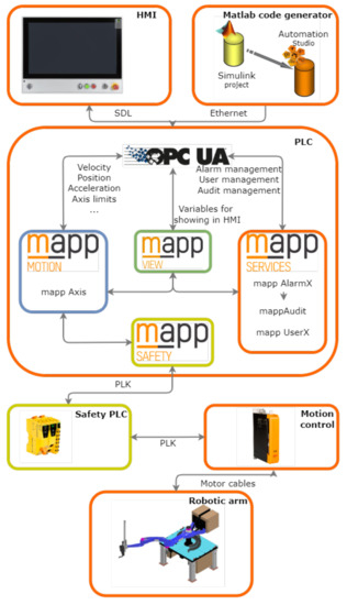 This control system concept allows us to create software using standardised function blocks and libraries, or mapp components, combined with the ability to implement more sophisticated control approaches in the Matlab/Simulink environment. Figure 1 demonstrates the concept of an open PLC-based control system of a printing robot, where PLK is an Ethernet powerlink bus, SDL is a shielded data link connector and HMI is a human–machine interface.