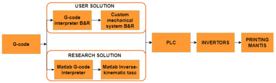 The G-code interpreter algorithm has been developed in two variants. The first variant is a user solution, where the user only needs to upload (e.g., via a USB flash drive) a 3D model of the printed object converted into G-code format. The control system then provides, using the Interpreter configuration file included in mapp Motion, the time-based code handling and sequential positioning of the robot’s print head while taking into account kinematic constraints. In this case, the effective positions of the robot joints are calculated using the custom mechanical system component of mapp Motion. This component allows to create a non-standard mechanical system using a configuration file. In our case, we have created five configurations with individual solutions to the inverse kinematics problem, see Section 4.1, and the user can choose the desired variant according to the requirements of the printed object.