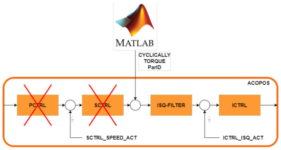 The final solution of the real-time torque control possibility can be seen in Figure 3. This solution consists of eliminating the speed and position controller for the cascaded servo control structure and then cyclically writing the appropriate parameter identifier (Par Id) with the desired torque to the Acopos servo amplifier. The whole control is controlled by a model created in Matlab/Simulink, which provides the timing of the cyclic input. During testing, the method worked very well and proved to be successful.