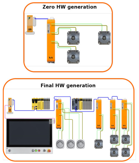 In the second phase of the development of the open control system, a first-generation robotic platform was developed. This robotic platform contains a 1:2 scale printing robot relative to the final printing robot, which is controlled by a control system that is identical to that of the final printing robot, hence the name final HW generation. Final HW generation brought improvements to the hardware configuration. The powerful PLC 5PC910.SX02 from the company B&R, synchronous motors with precision harmonic gears, Safety PLC, an HMI panel and a robust aluminium construction were used.