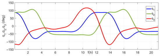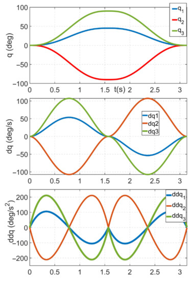 The last phase of the experiment was the implementation of the control based on the obtained dynamic model. A fifth-order polynomial in joint space was used to generate the reference trajectory. The motion of all joints was based on zero, with the motion of the first axis from ( 0 , 45 , 0 ) with a peak velocity of 53.71 / s and a peak acceleration of 105.3 / s 2 , and the motion of the second and third axes from ( 0 , ± 90 , 0 ) with a peak velocity of 107.43 / s and a peak acceleration of 210.6 / s 2 . The resulting motion corresponds to the “folding” and “unfolding” of the robotic manipulator, and the trajectory was designed purely for test control purposes, so that the axes interact. Figure 9 demonstrates the desired trajectories for each joint.