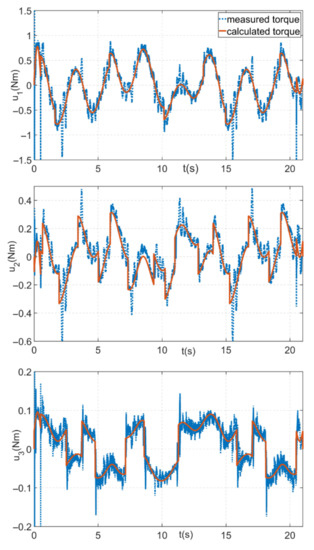 If we consider the parameters obtained from the model as the actual parameters of the arm, the maximum percentage error of the parameter estimation would be less than 28 percent, which is not the best result. In reality, however, the assumption of considering the inertia of the parameters obtained from the 3D model as the real ones is not very relevant, because the 3D model has limited accuracy and, in addition, the influence of, e.g., supply cables, etc., on the arm. From the presented traces of torques comparing the estimated and actual torques, it can be seen that the torques calculated from the identified parameters represent the measured torques relatively well.