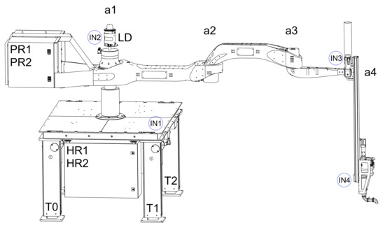 The control system is constructed with new peripherals in the form of tilt meters and lidar for the ability to test the self-levelling of the robot base and to solve print arm localisation tasks. The experimental print arm is equipped with four inclinometers from Sick to compensate for unevenness and deviations from the print plane. As can be seen in Figure 11, the main inclinometer, labelled IN1, is located in the robot table plane. It can measure tilt in three x,y,z axes and can be used to level the table with the environment. The other inclinometers, marked IN2, IN3, and IN4, are located directly on the robot arm structure. IN2 and IN3 are inclinometers with the ability to measure tilt in two x,y axes and are used to measure any deflection of the lidar (LD) and the end link of the arm (a3). The last inclinometer, IN4, is also tri-axial and is prepared for the case of extending the robot with a tangential axis; its output can give information about the rotation of the tangential axis on which a print head can be placed. Another peripheral is a 2D lidar from SICK, model SICK NAV350 (SICK AG, Baden-Wuerttemberg, Deutschland). LD lidar is used here for endpoint localisation and guidance capabilities.
