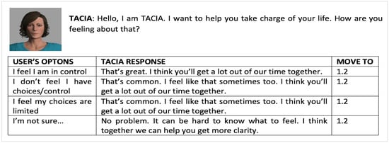 Example of TaCIA’s dialogue tree, the user’s options, and ECA’s Response.
