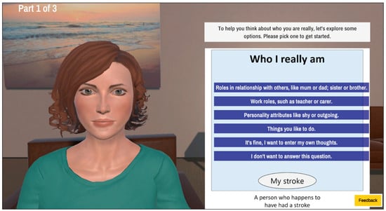 Generally, the delivery of face-to-face interventions like the ‘Take Charge’ intervention poses some challenges both in delivery and participation by the stroke survivor—for example, facilitators reaching remote areas, financial costs involved in delivery by and travel to a facilitator, time availability, limited trained facilitators, and flexibility and/or preference of the stroke survivor to disclose sensitive information and feelings after stroke. Artificially Intelligent technology known as Embodied Conversational Agents (ECA) has been used in healthcare to address these challenges. ECAs can be defined as computer-generated humanlike characters that can exhibit similar properties as humans in a face-to-face conversation, including the ability to produce and respond to communication in a verbal and non-verbal way [6]. As a conversational agent, ECAs are like chatbots, but chatbots do not have an embodiment. Some chatbots also do not have a voice, only textual dialogue. As well as a humanlike face and partial or full body representation, ECAs tend to have animations such as facial expressions and body gestures and also tend to have spoken dialogue. Thus, ECAs include more humanlike qualities than chatbots. ECAs are also known as Intelligent Virtual Agents, highlighting that their embodiment is virtual, rather than physical. Therefore, they are better able to address the aforementioned challenges than assistive or social robots that have a physical presence requiring specialized hardware. By existing in virtual environments, ECAs enhance virtual worlds by providing a social experience [7]. However, Cassell, Bickmore, Campbell, Vilhjalmsson and Yan [8] reinforce that when designing an interactive system, ECAs should be specifically conversational in demonstrating their humanlike behaviors.