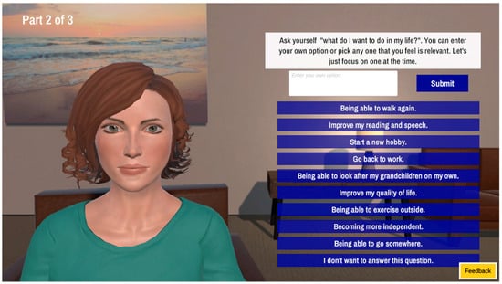 The ‘Looking at the big picture’ stage aims to assist the stroke survivor to reflect on what is most important to them. Each step poses questions that help the stroke survivor look beyond the stroke, allowing the person at the end to describe who they really are, giving context about where they want to be, and empowering them to make this happen: the self-rehabilitation. An example of a question with options is presented in Figure 3.
